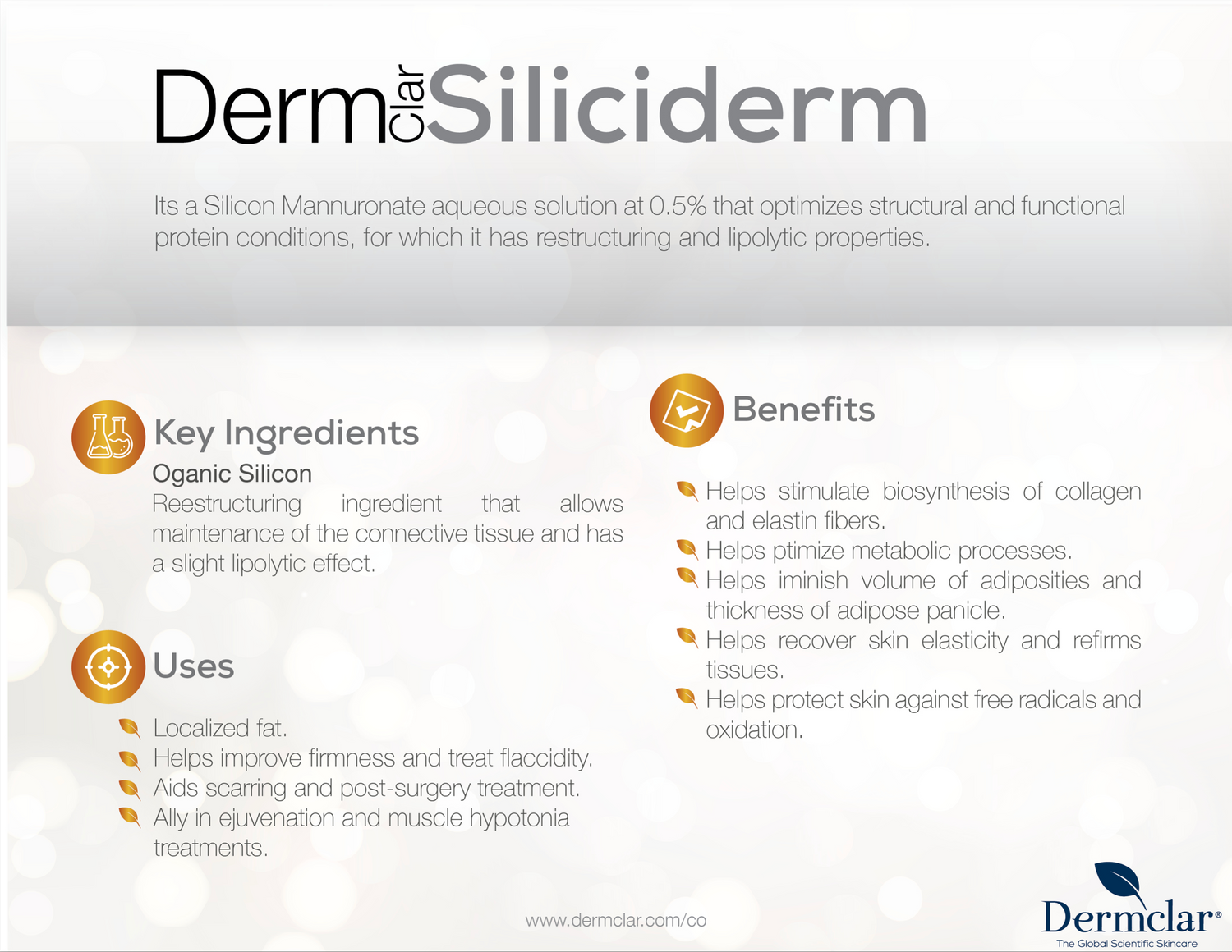 Organic Silicium solution is a versatile product that helps fight flaccidity, rejuvenates, and treats adiposities. It is used in many facial and body treatments. It helps regenerate the skin and stimulates fibroblastic activity. It acts as a cellular regenerator and antioxidant, prevents premature aging, provides skin nutrition, and improves stretch marks and scars. It also provides a lipolysis effect.