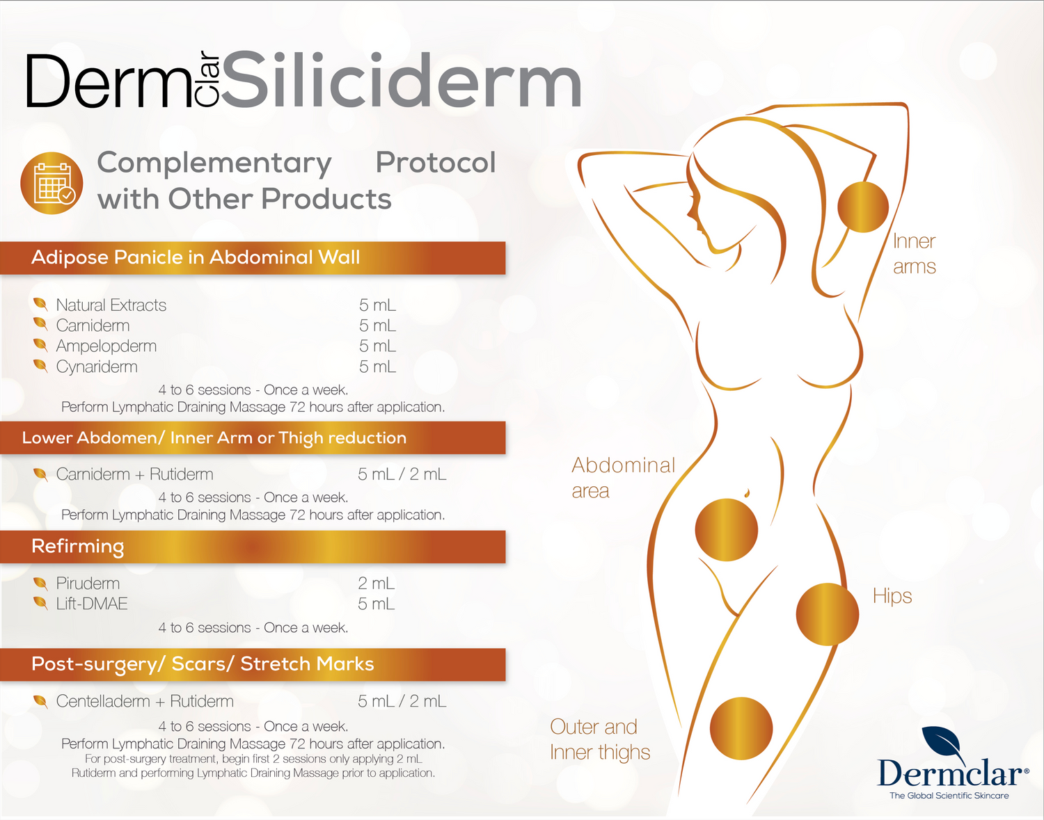 Organic Silicium is recommended to be used topically with microneedles or nanoneedles, after chemical peels, with electroporation, iontophoresis (galvanic current), and ultrasound penetration. The product can be applied weekly for a series of 4-6 consecutive sessions. Use 5ml of Organic Silicium depending on how much fat/photodamage/flaccidity is present and the size of the treated area.