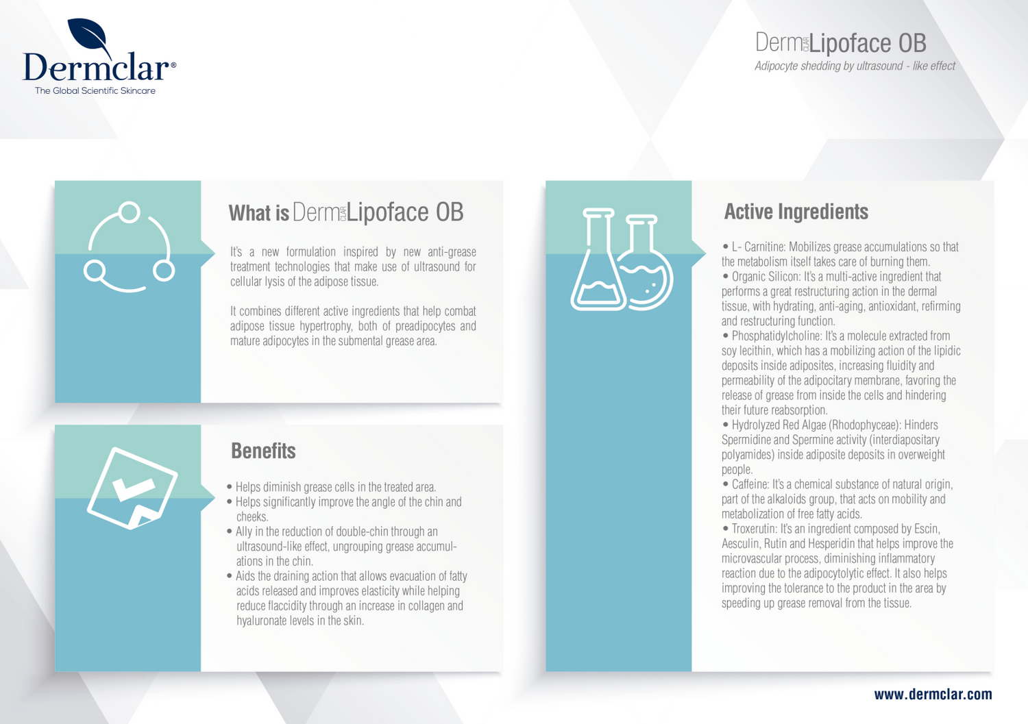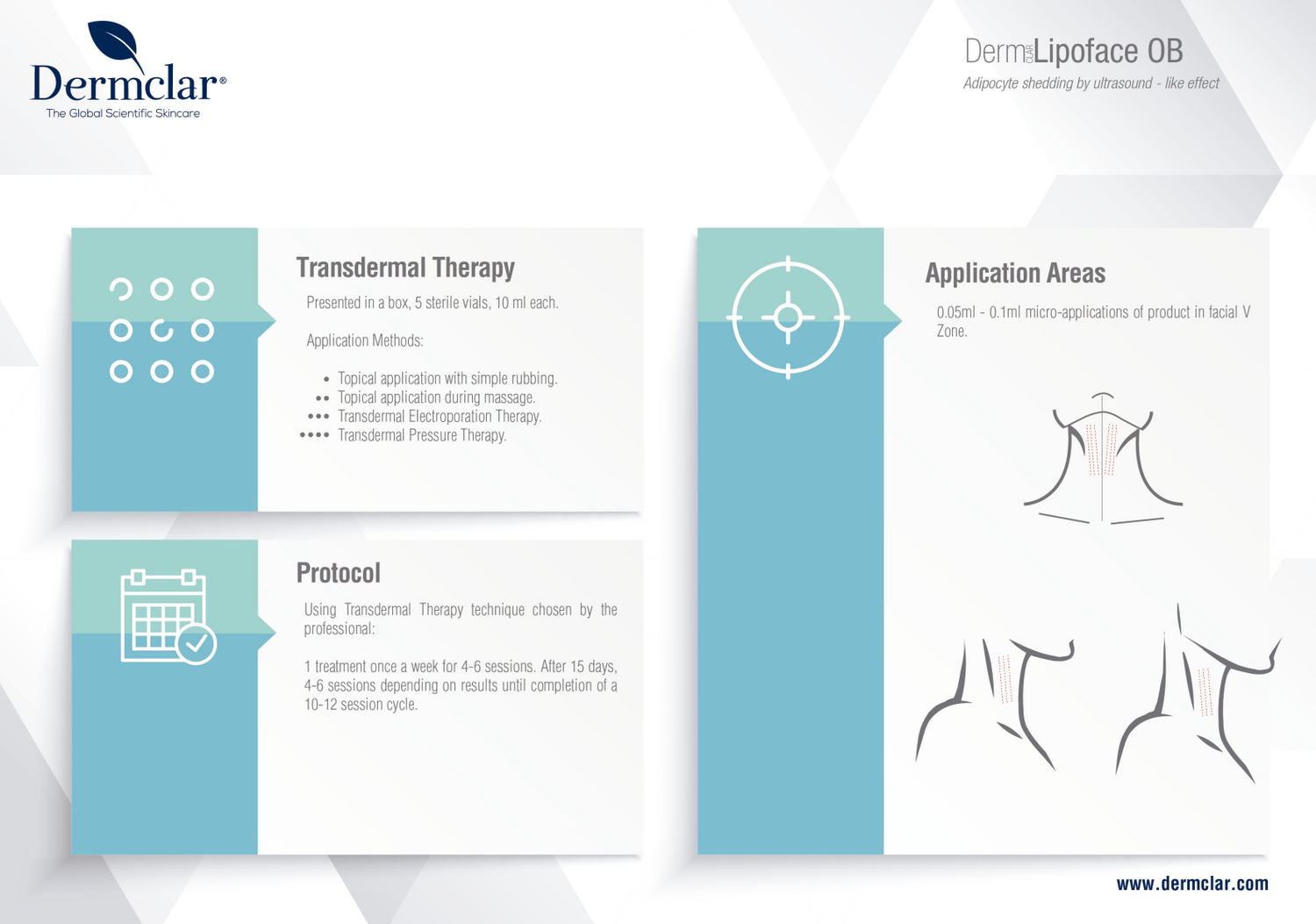 Lipoface OB is recommended to be used topically in the double chin area with micro needles or nanoneedles after chemical peels, electroporation, iontophoresis (galvanic current), and ultrasound penetration. The product can be applied weekly for 6-8 consecutive sessions.