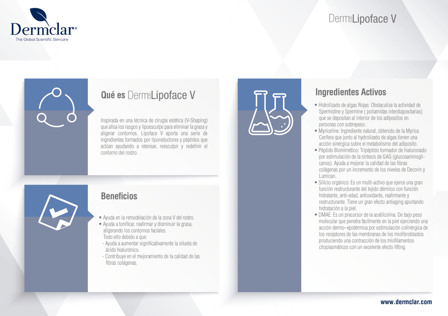 DermLipoface V is designed to help treat the double chin flaccidity, bringing the "V" shape effect. Lipoface has two separate effects: the remodeling effect and the firming effect. It helps improve notably the facial contours and double chin. It contains lipolytic agents and peptides to firm the double chin and other body parts.