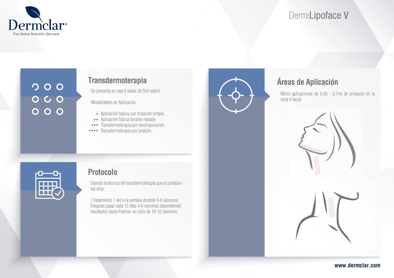 DermLipoface V is recommended to be used topically in the double chin area with micro needles or nanoneedles after chemical peels, electroporation, iontophoresis (galvanic current), and ultrasound penetration. The product can be applied weekly for 6-8 consecutive sessions. Follow up: 1 session monthly. Use 5-10ml of DermLipoface V depending on how much flaccidity is present and the size of the treated area.