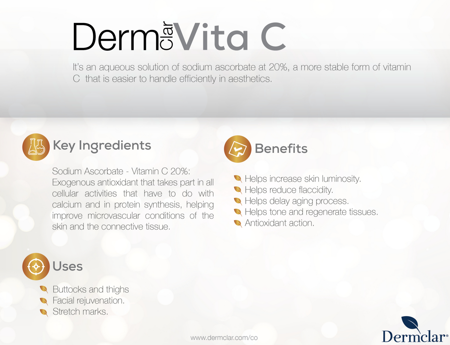 Vitamin C prevents premature photo-aging, works against free radicals, improves stretch marks, improves skin tone, and hydrates the skin.